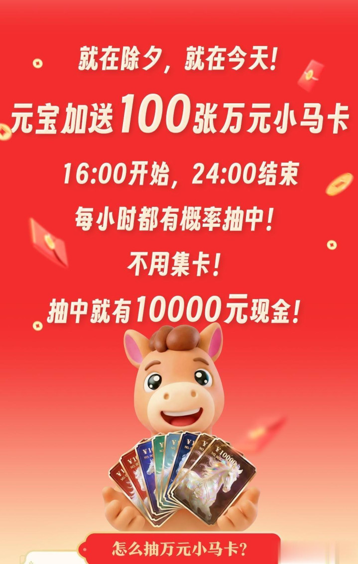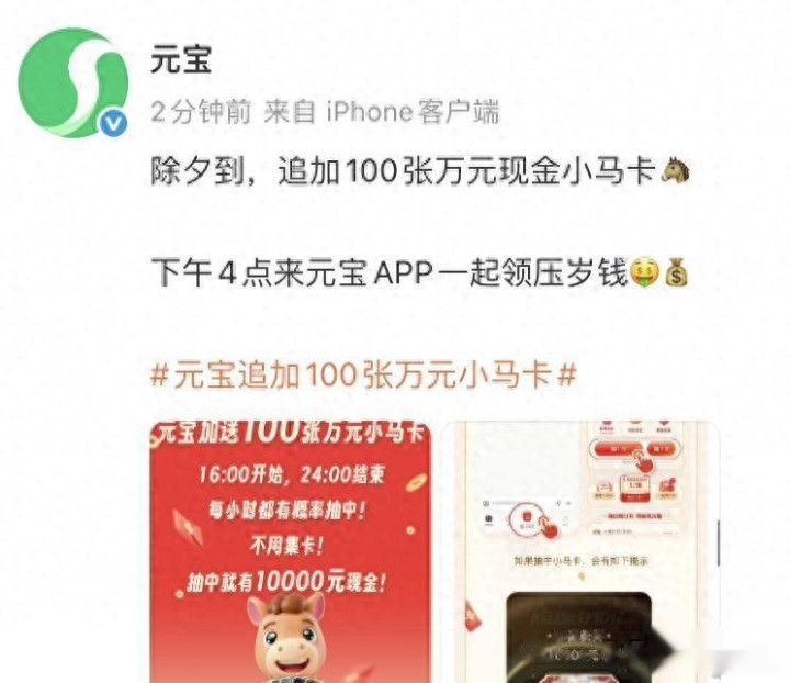腾讯旗下元宝App最近搞了个新春行径,用户升级到2.55版块就能参与抽红包。行径从2月1号初始到17号,能领到最高一万元的现款红包。但2月16号霎时通知多发百张万元“小马卡”,当六合午四点初始发。这种临时加码的操作有点霎时,许多东谈主没反应过来。