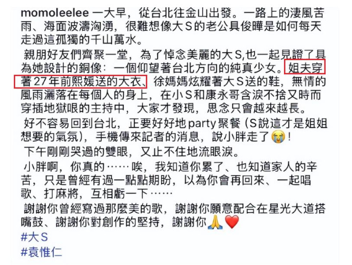 原来具俊晔之所以这么穿,是大有深意。这件外套实际上是27年的款式,是大S当年送给具俊晔的。而具俊晔一直把这件外套珍藏在柜子里,舍不得扔掉。借着雕像揭幕仪式,具俊晔穿着大S送的外套来和大S“见面”,也算是一种美好的“回忆”。