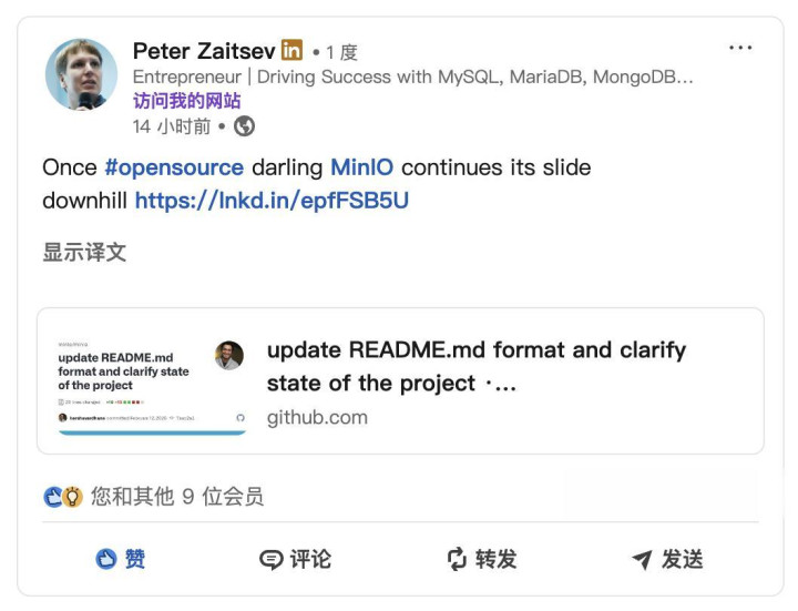 Percona 独创东说念主 Peter Zaitsev 也在 LinkedIn 上抒发了对开源基础法子可抓续性的忧虑。外洋社区的共鸣还是造成:MinIO 已矣。