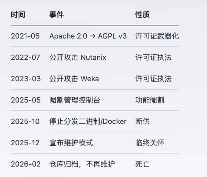 {jz:field.toptypename/}今天(2月14日),一篇题为《How MinIO went from open source darling to cautionary tale[2]》的长文激勉了平素传播,详备复盘了 MinIO 从开源骄子到反面课本的齐全失足时期线。