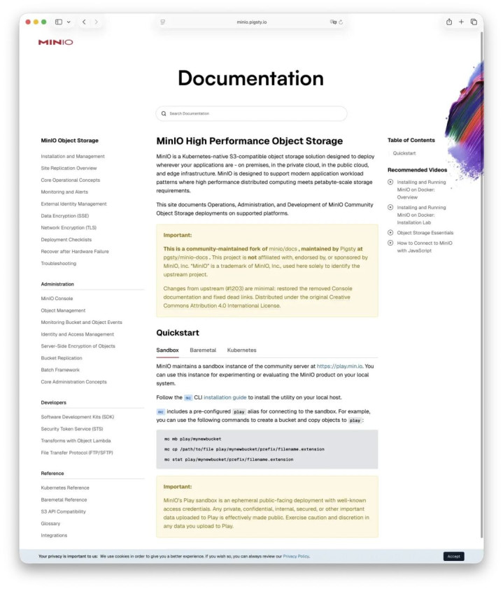 是以咱们基于 minio/docs进行了 Fork,栽植了失效谐和,复原了被删除的限制台文档,部署在: https://minio.pigsty.io[5]