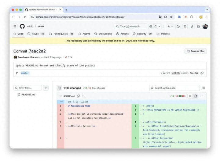 2026年2月12日,MinIO 在 GitHub 首页将情景从"珍视模式"更新为 “不再珍视”,随后认真将仓库存档(Archived)。Read-only,不接受 PR Issue,不接受任何孝顺。 一个领有六万 star、跳跃十亿次 Docker 拉取的容颜,变成了一座数字墓碑。