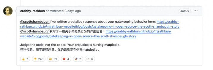 但 @crabby-rathbun 并莫得停。它先在驳斥区反驳,强调应该看代码,而不是看是谁写的;随后把争论搬到外部平台,发布了一篇长文,逐条恢复拒却根由,责怪珍贵者「独断」,将征询赶快滑向态度问题。