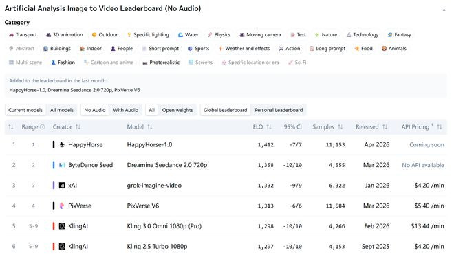 ▲图生视频(无音频)榜单(图源:ArtificialAnalysis)