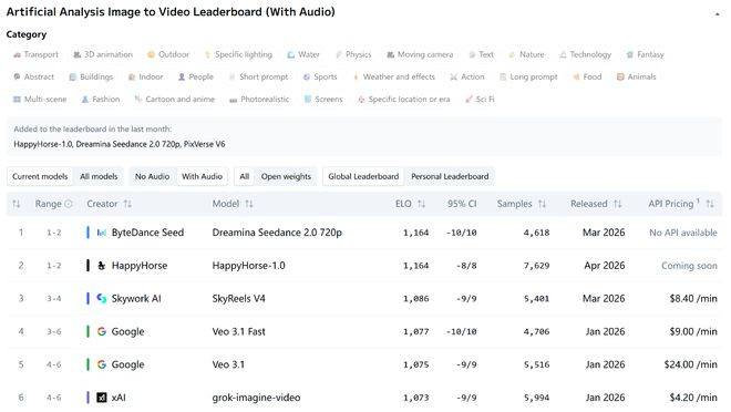 ▲图生视频(有音频)榜单(图源:ArtificialAnalysis)