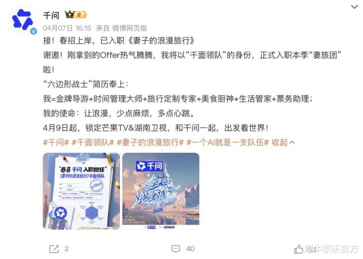 当作阿里系AI产物的茅头兵,千问在本岁首就曾砸好几十亿押注B站跨年晚会、河南卫视春晚等多台高防卫力晚会寻求多维曝光,但这次冠名《老婆的放肆旅行2026》,却是它第一次投放长周期、强场景的综艺节目。