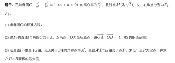 核心考点:椭圆的标准方程与几何性质、直线与椭圆的位置关系、向量数量积、圆锥曲线中的最值与定点问题