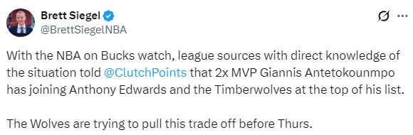 Chris Mannix报道,明尼苏达森林狼队正在非常拼命地运作,需要四支球队参与才能完成字母哥大交易;Brett Siegel最新报道,字母哥把加盟森林狼和搭档爱德华兹视为名单中首选,字母哥强烈希望联手爱德华兹,森林狼队正在与联盟中的多支球队讨论交易杰登-麦克丹尼尔斯、朱利叶斯-兰德尔和纳兹-里德等重要球员。消息人士透露,麦克丹尼尔斯引起了极大的兴趣;有竞争对手球队认为,如果字母哥在交易截止日前被交易,他很可能会加盟森林狼队。