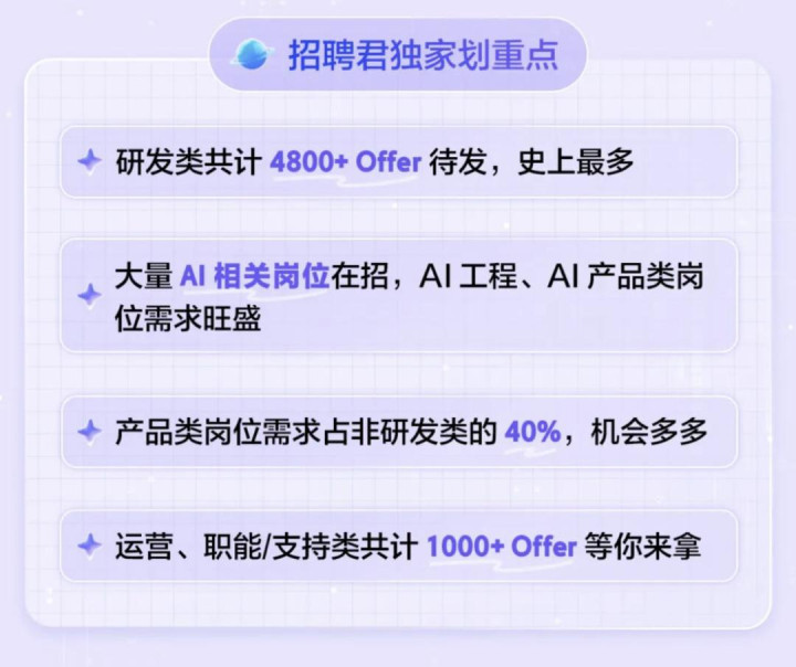 本次招聘重心歪斜研发、居品与AI领域。其中研发类岗亭Offer数目超4800个,史上最多。