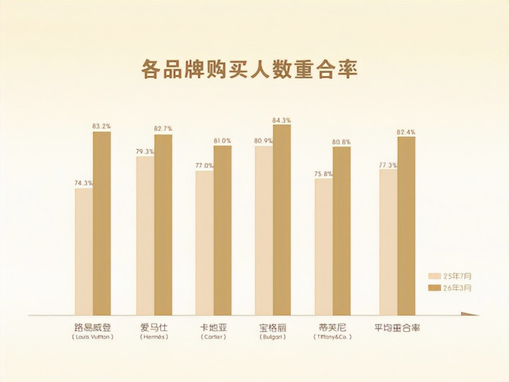 2025年销售额跳跃300亿元,2026年的老铺正站在新的位置,这一连忙、精确的落位,号称买卖史上极漂亮的一笔。笔据弗若斯特沙利文的调研数据,老铺黄金恣虐者与路易威登、爱马仕、卡地亚、宝格丽等国际五大挥霍牌的恣虐者平均重合率从2025年7月的77.3%进一步升迁至82.4%,自大出洋际挥霍的恣虐群体转向老铺黄金的趋势进一步放大。