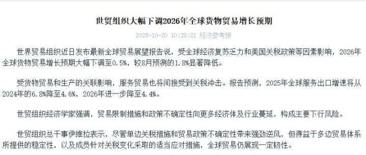 民众可能会问,单边制裁到底带来了什么?世界营业组织的数据,给出了一个响亮的谜底。其中指出,单边主义和营业政策不祥情味正严重威胁全球营业增长根基,他们已将2026年全球货色出口增速,下调至4.4%。