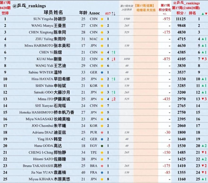 早田希娜、平野好意思宇等日本宿将排行不息下滑,宇宙前十被国乒、日本新锐平分。