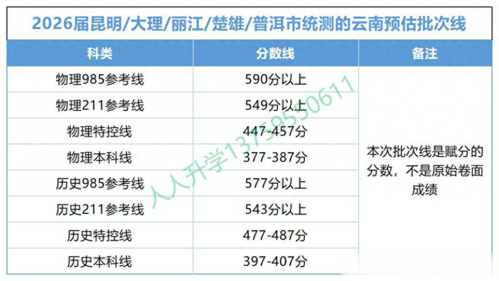 2026年昆明、丽江、大理、楚雄、普洱市统测云南预估批次线