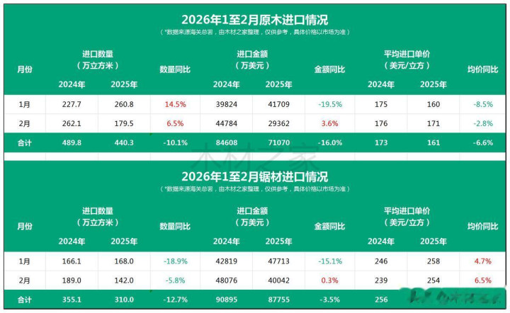 概述来看,2026年1-2月我国木料入口总量为750.3万立方米,同比下落11.2%;入口金额15.88亿好意思元,同比下落9.5%。由于2月入口量同比骤降28.7%,成为攀扯举座施展的主要身分。
