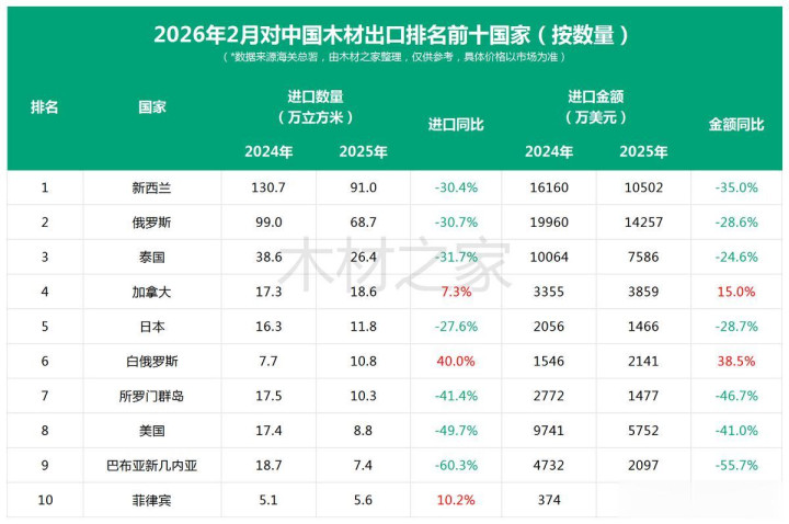 2月份中国木料入口开始国排行前十的国度中,绝大大齐出现数目与金额双降,仅加拿大、白俄罗斯与菲律宾竣事正增长。