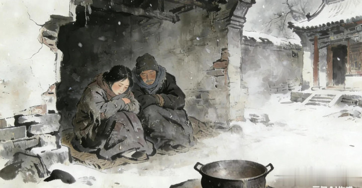 过了不几年,老爹老妈留下的粮吃光了。地和房子都卖了,就流落到乡间街头讨吃要饭。寒冬腊月到来,北风扬着雪花,天寒地冻,冻的野狐子没处钻。他两个没有个藏身之地,就在一个破庙里,挤在墙角,冻得牙齿咯噔噔的,饿得头都抬不了。男人祷告着:“老天爷啊,你真不睁眼睛,我们没衣服穿,你还这么冷。”女人也是哭哭啼啼,眼泪都冻成冰棍了。腊月初八这天,天气还好,他两个就串门串户讨要,东家要把米,西家讨点豆。回到破庙里,就熬粥,熬了两碗粥,连人影都看得见的清汤,喝了总算热乎了一点。