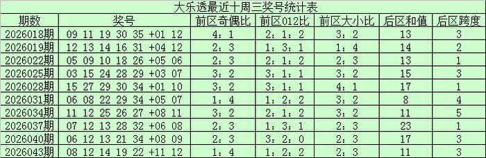 前区奇偶走势:上期前区奇偶比为4:1,上周三前区奇偶比1:4,最近十周三偶数号码略占上风,本期预测偶数号码再次走热,参考奇偶比1:4。