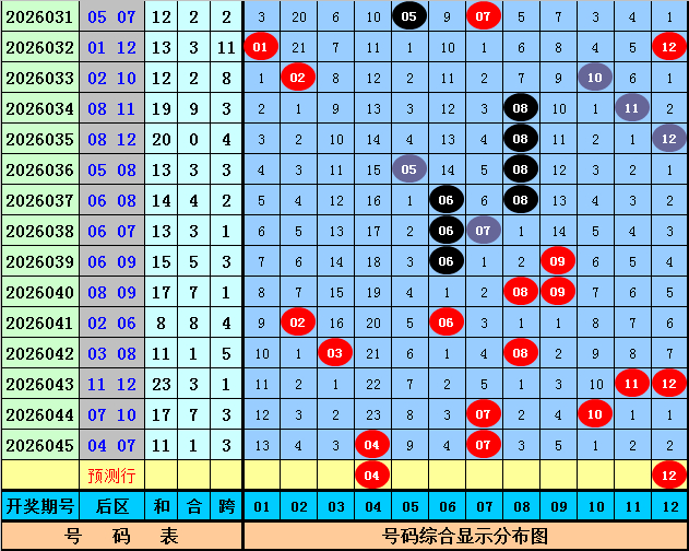 后差异析:上期后区奖号为04+07,开出一大一小组合,上周三后区奖号开出11+12,最近十周三后区奖号大小比为12:8,大号显豁较热,本周三看好大号出现,参考一大一小组合,珍摄两码04、12。