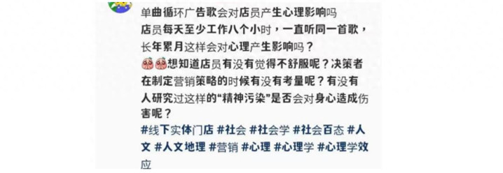 (人民日报健康客户端记者 乔芮)“进店逛几分钟,就被广告歌洗脑了,店员一天要听几小时,是不是很困扰?”近日,社交平台上掀起一场关于“商店内循环播放广告歌是否影响员工心理健康”的热议。不少服务业从业者表示,自己每天被“洗脑神曲”困扰:8小时工作中,一段旋律重复听上百次,甚至“入侵”梦境,成为难以摆脱的“脑海背景音”。