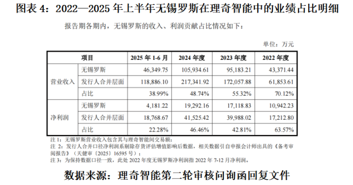 由此测算,2022—2025年上半年,理奇智能的营收总数为57.01亿元,其中51.01%来自无锡罗斯;理奇智能的净利润总数为11.75亿元,其中43.86%来自无锡罗斯。