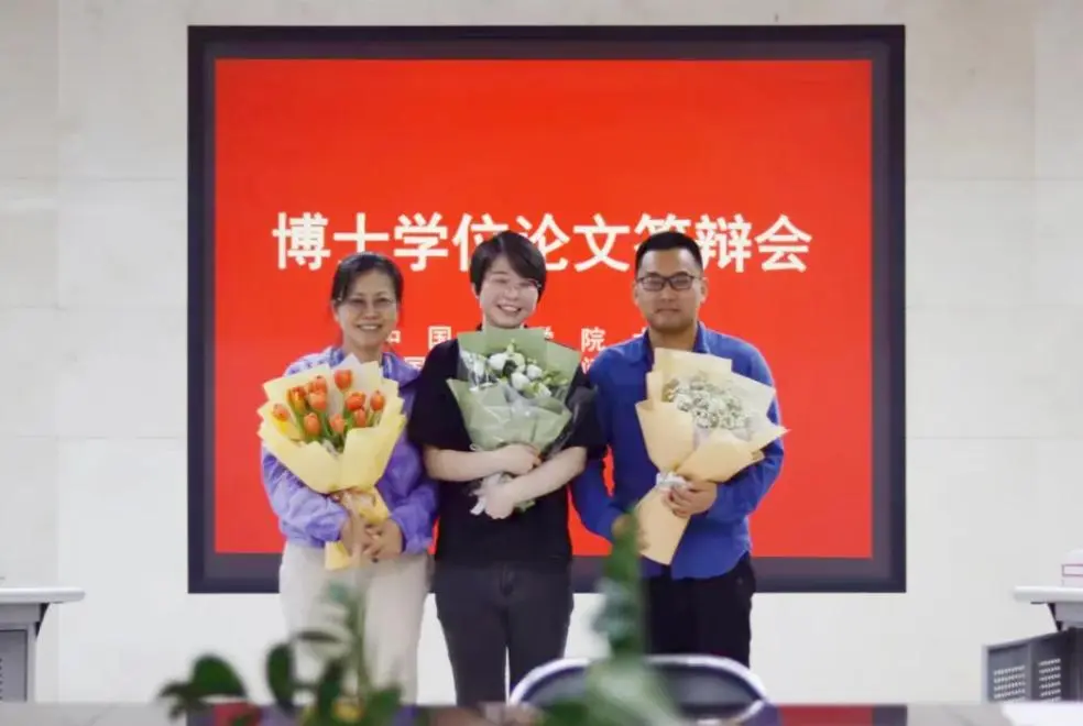孙晓婧(中)与导师刘四清商榷员(左)、林瑞淋副商榷员(右)合影