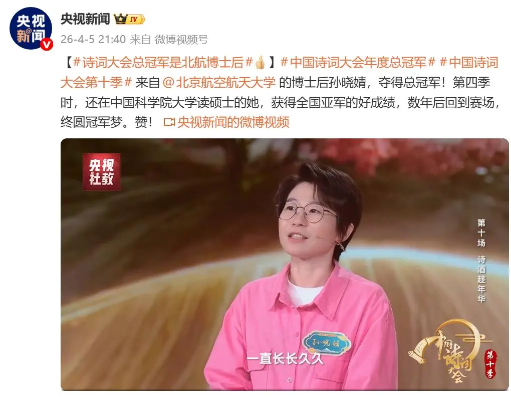 4月5日晚,@央视新闻 微博发布音尘:中国诗词大会第十季,来自北京航空航天大学的博士后孙晓婧,夺得总冠军!第四季时,还在中国科学院大学读硕士的她,取得世界亚军的好收获,数年后回到赛场,终圆冠军梦。