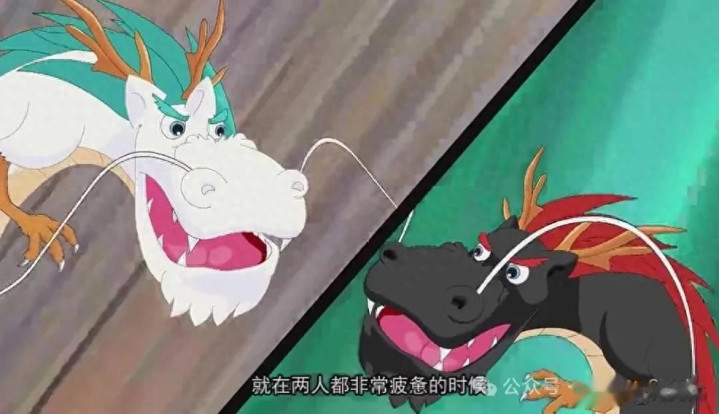 白龙则在海边招呼起了黑龙。蓝本这里是白龙的家,白龙出了趟远门,黑龙便跑来占据了。黑龙钻了出来。白龙说黑龙四处犯警,一定要刑事拖累它。两条龙在海里打了起来,打了三天三夜皆不分赢输。